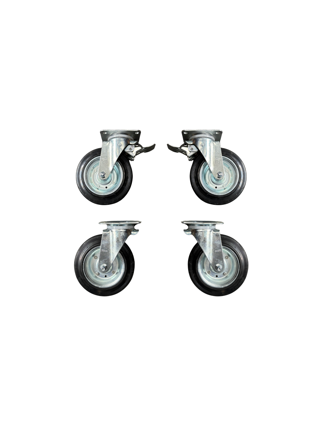Ensemble de 4 roues semi-renforcées de 200 mm dont 2 freinées - Galette acier - Roulements à billes cage - Entretoise acier - Bandage caoutchouc - Equipement pour bacs lourds - Charge 205 Kg/roue Poids : 10 Kg