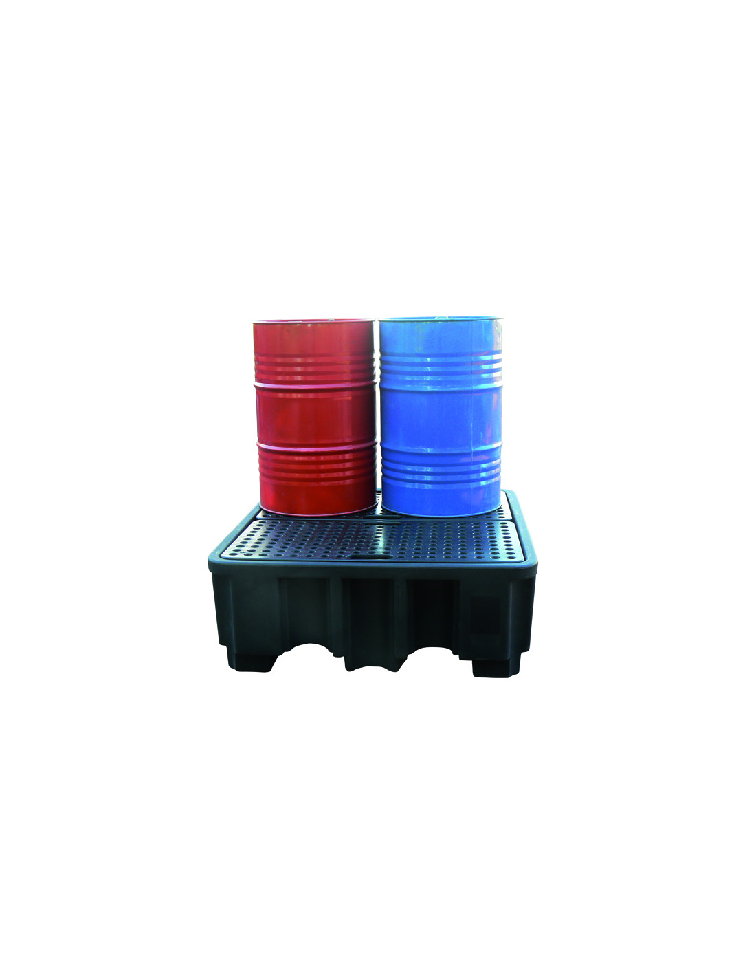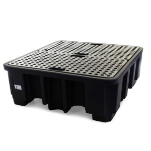PEHD noir très résistant aux chocs - Caillebotis PEHD noir amovible - Totalement anti corrosion Charge 1250 kg - Prise fourche pour déplacement - Palette pour 4 Fûts - volume 485 L
