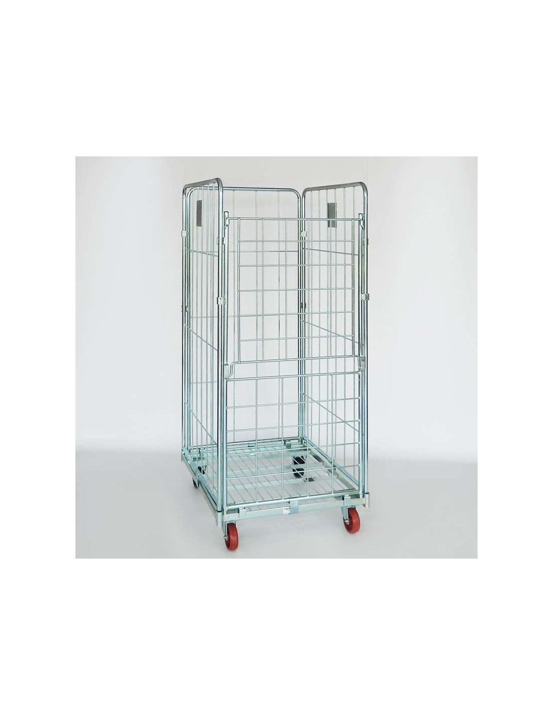 Fils acier zingué verni - Tube de 20 mm - Base grillagée maille 45 x 180 mm - 2 côtés maille 106 x 405 mm - Roues polypropylène 106 mm dont 2 fixes - Demi-porte rabattable - Dim int : 655 x 800 x 1440 mm - Volume : 850 Litres - Charge admissible : 500 kg Dim ext : 715 x 805 x 1600 mm - Poids : 32 Kg